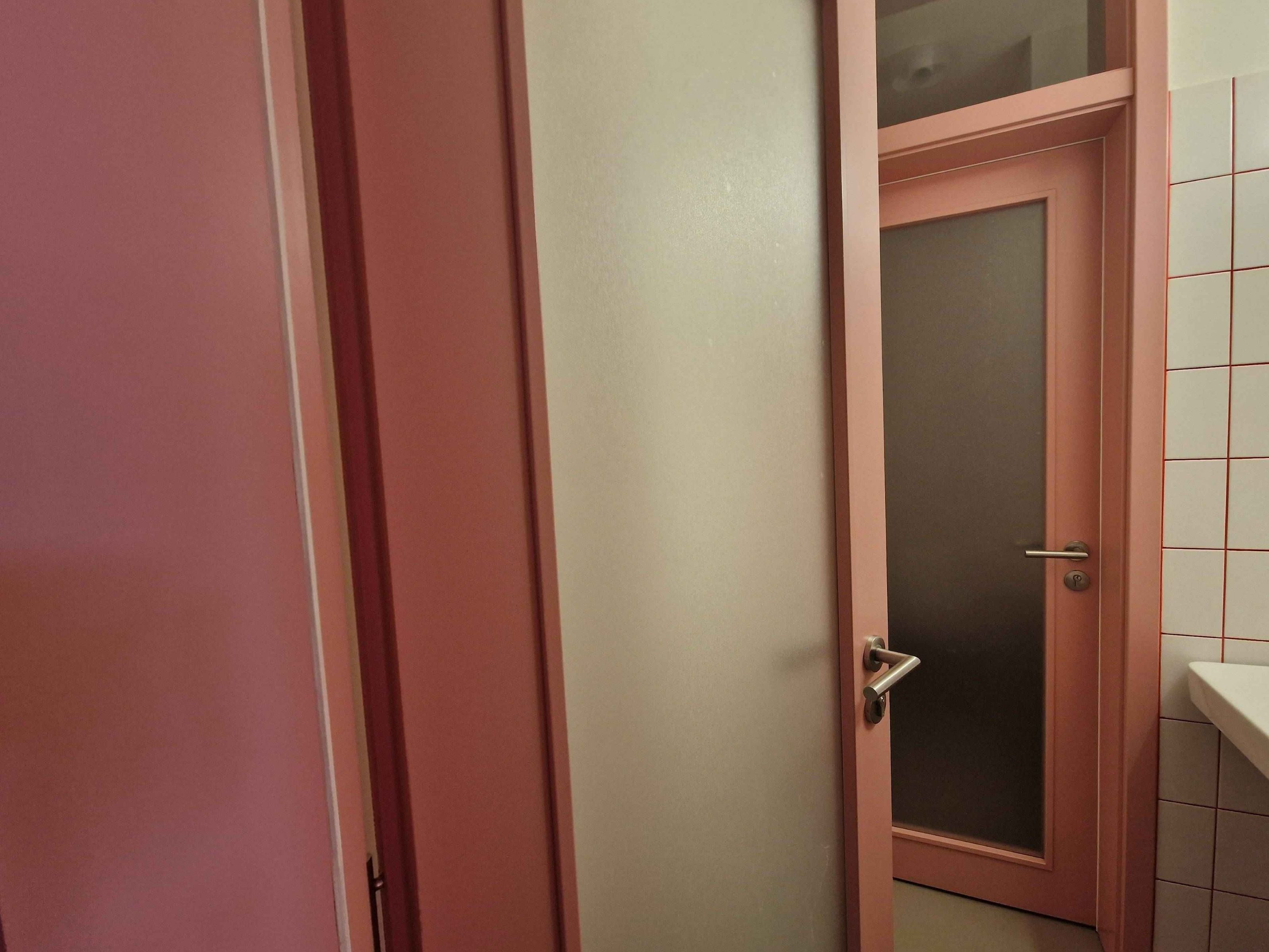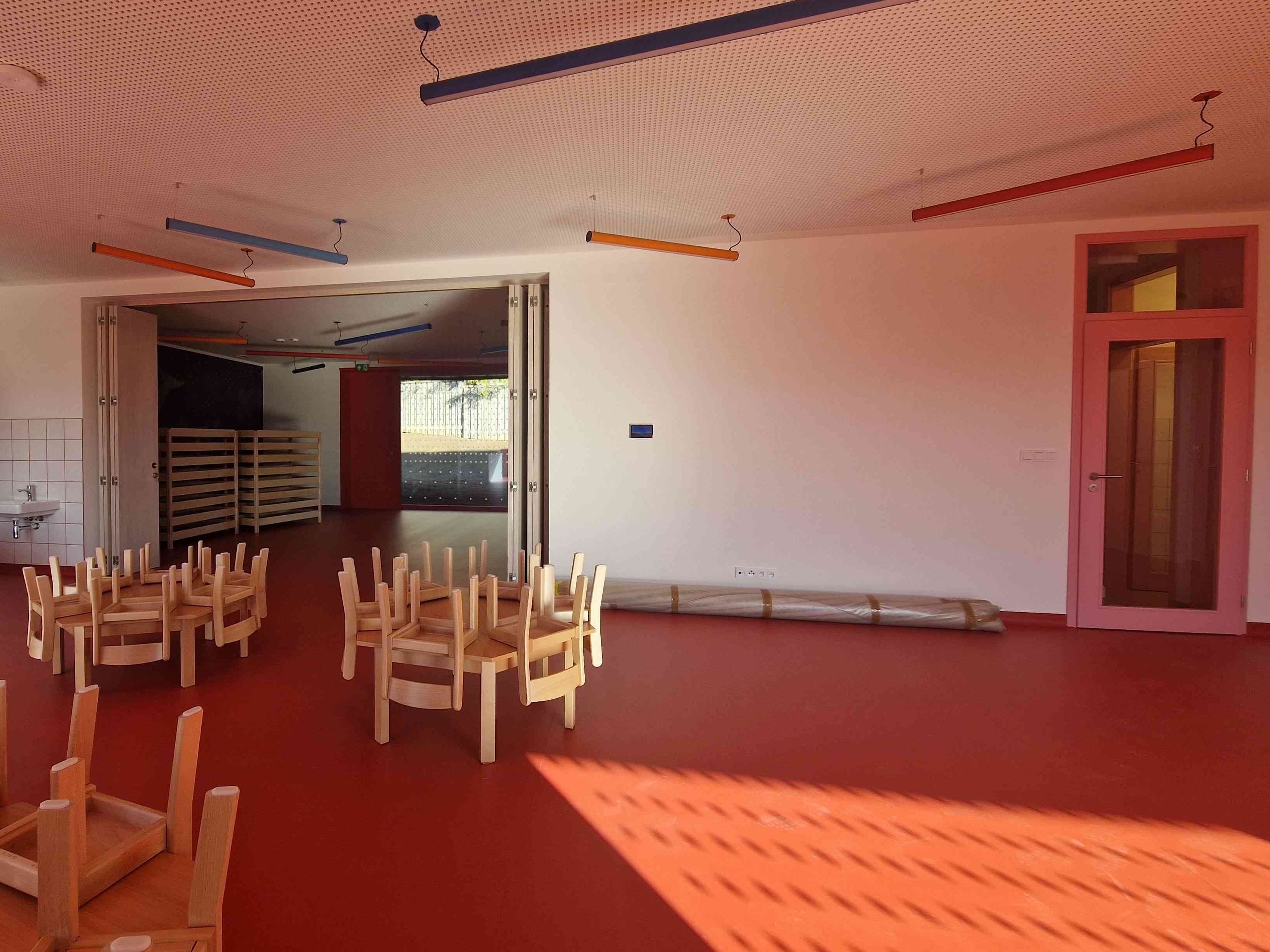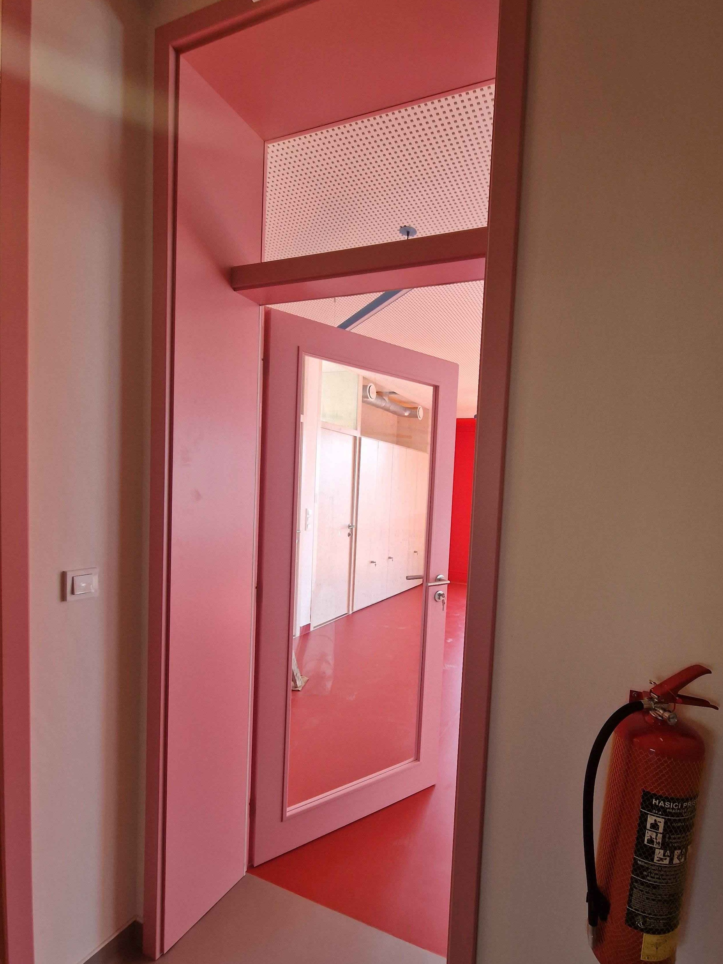 Barevné lakované dveře s velkou prosklenou plochou přispívají k přirozenému prosvětlení interiéru a zároveň umožňují snadnou orientaci a dohled v prostoru dětské skupiny. Použité materiály a bezpečnostní sklo odpovídají požadavkům na provoz ve školských a vzdělávacích objektech.